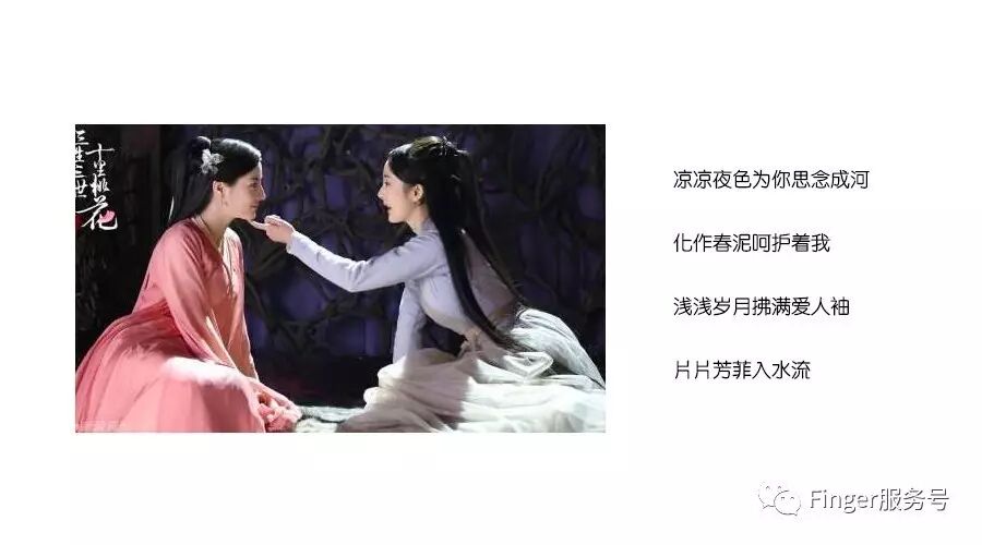 电视剧《三生三世十里桃花》片尾曲《凉凉》,歌曲由实力派歌手张碧晨和杨宗纬感动演绎,以男女对唱的形式,用温柔的女声视角试图表达白浅心声,对这一份命中注定又充满坎坷的惊世之爱从憧憬到心碎最后不悔,点滴变化均呈现在张碧晨声色演绎和旋律演进中,而杨宗纬男声部分的演绎则填补了女声过于柔美空灵的观感,是让人有安全感的温柔包围,杨宗纬醇净细腻的声线与张碧晨遥相呼应,形成默契的音乐气场,让观众在《凉凉》中提前抵达三生三世桃花纷飞的庞大梦境。