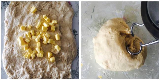 2.面团揉至扩展阶段,加入软化的黄油,继续揉面,此时揉面工作可以借助电动揉面棒或者面包机进行。