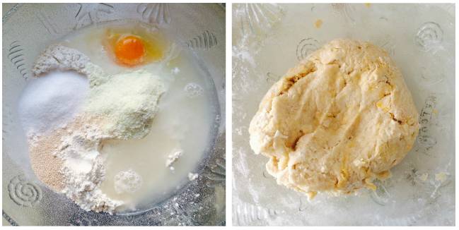 1.面包体:将主面团里除黄油外所有材料放在干净的盆里,搅拌成面团后,放在干净的案板上开始揉面。