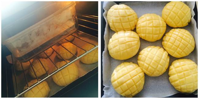 13.放入烤箱进行2次发酵,发酵至2—2.5倍大(如下图),约40分钟左右。发酵的时候可以在烤箱里放置些温水增加湿度。