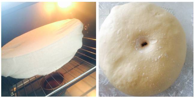 4.盖上拧干的湿纱布,放入烤箱发酵50分钟左右。烤箱里可以放点温水,增加湿度。发酵好的面团,蘸面粉戳一个洞不反弹即可。