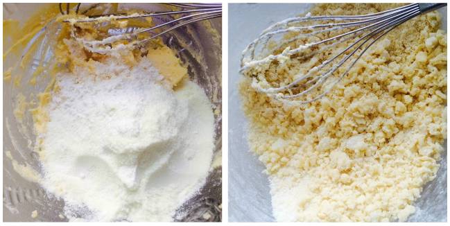 8.筛入低筋面粉、奶粉及盐的混合物,搅拌成粗颗粒状。