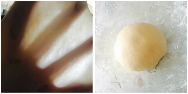 3.揉至面团可以拉出手套膜停止揉面,然后整形成光滑的面团,放入盆中。