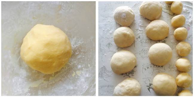 9.用手揉成团,不要过度揉,会影响酥皮的酥性。然后将酥皮也分成8等份。