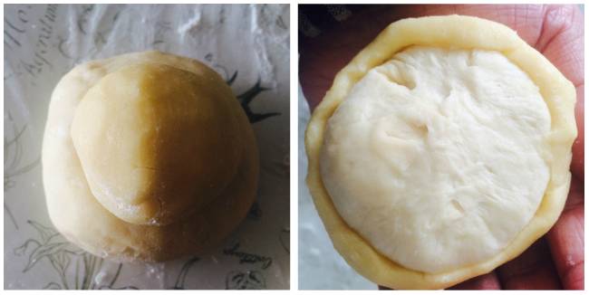 10.组合:取一份酥皮和一个面团放在一起,将酥皮的一面放在掌心,将面团轻轻往酥皮里压,边压边收拢面团,至酥皮包裹住三分之二的面团为止。