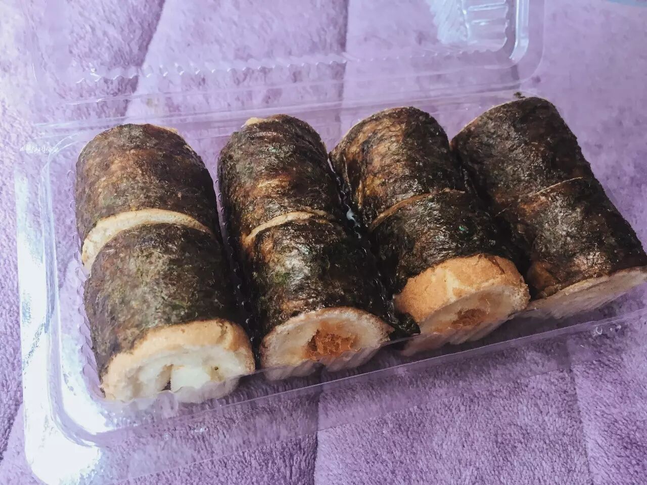 再来说说紫菜肉松卷吧,这一盒装有8个蛋糕卷,每一个都不大,就像我们平时吃的寿司大小。