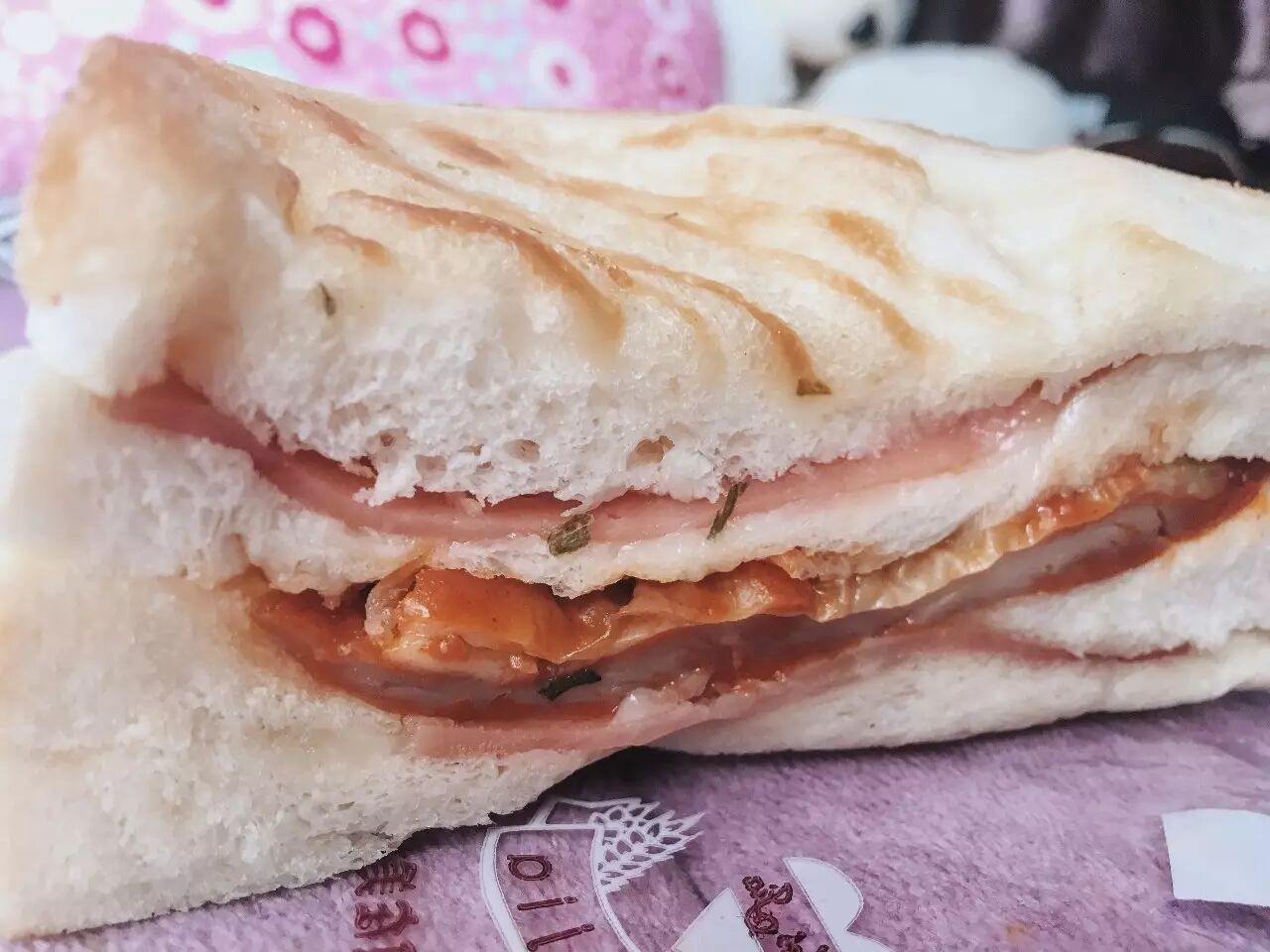 做三文治的面包非常松软,没有那种硬的硌牙的口感让人很安心,它一共有四层,中间夹着两片午餐肉和一大块鸡排。