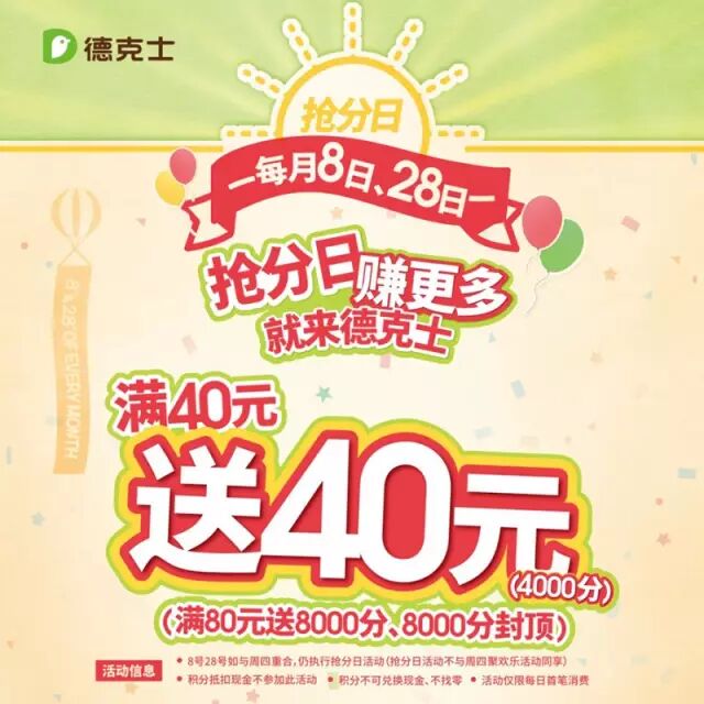 2、活动当天首笔消费满40元,可额外获赠4000积分,满80元送8000积分(8000积分封顶),积分支付及电子券消费除外;