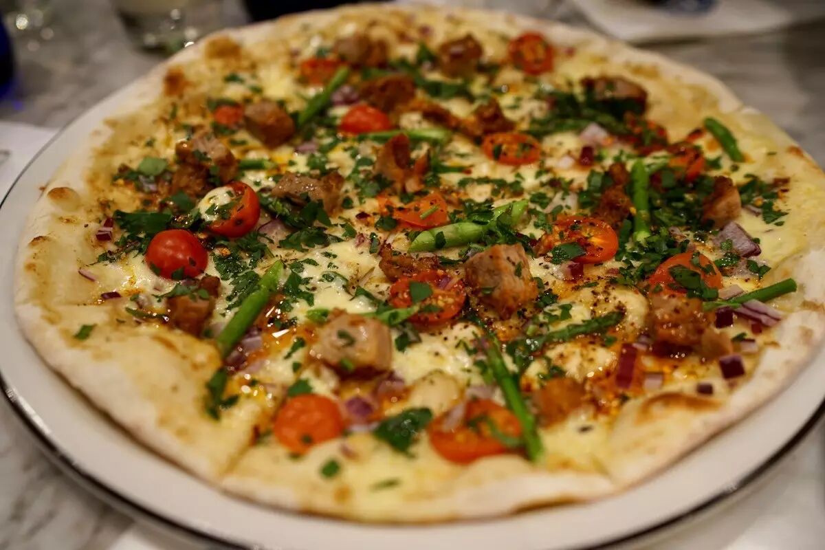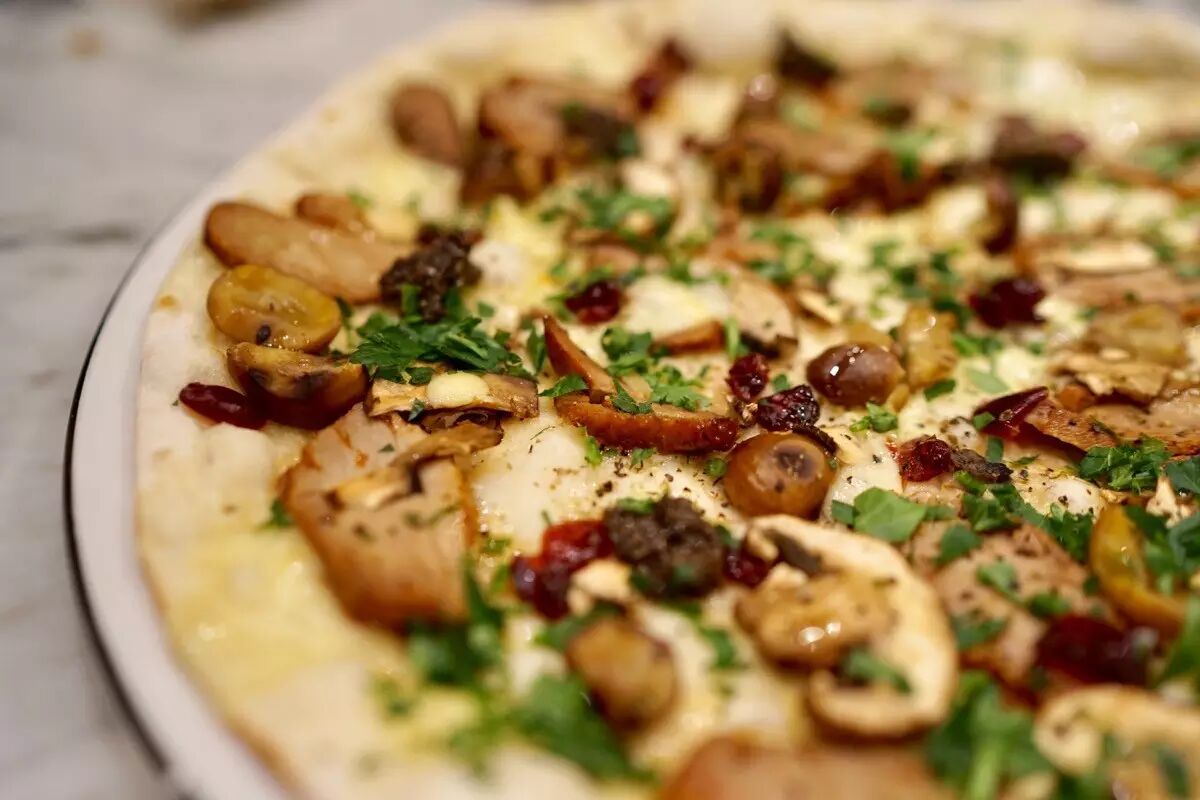 最后一道就是圣诞季新出的北京烤鸭披萨了,也是颇受好评的一个口味。其实烤鸭和披萨的搭配这并不是第一次,只是到了这里又有不一样的风味。北京烤鸭搭配西式的香料,还有整颗的栗子、菌菇,缀以黑松露酱,口感层次很丰富,我很喜欢。