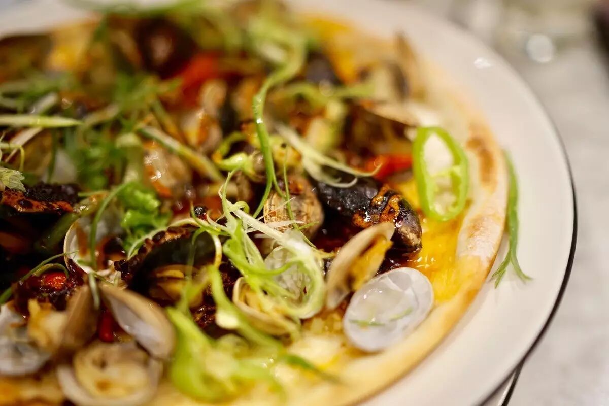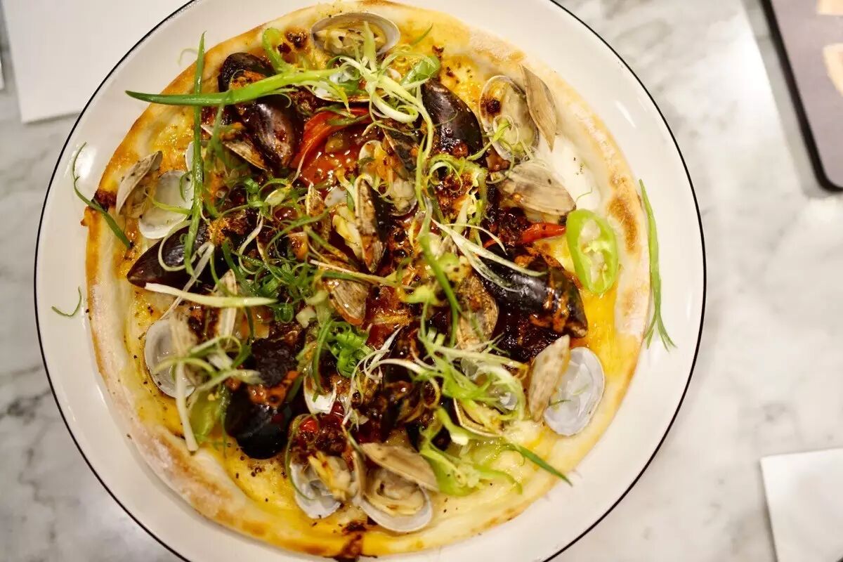 这款披萨特别烤得很脆,用碗装上来,碗底就是带有老干妈的酱汁,将香脆的披萨蘸着老干妈味的酱汁一起吃,还真蛮有趣的。披萨上的青口以及蛤蜊也都融入了老干妈味,作为前菜吃很是开胃。