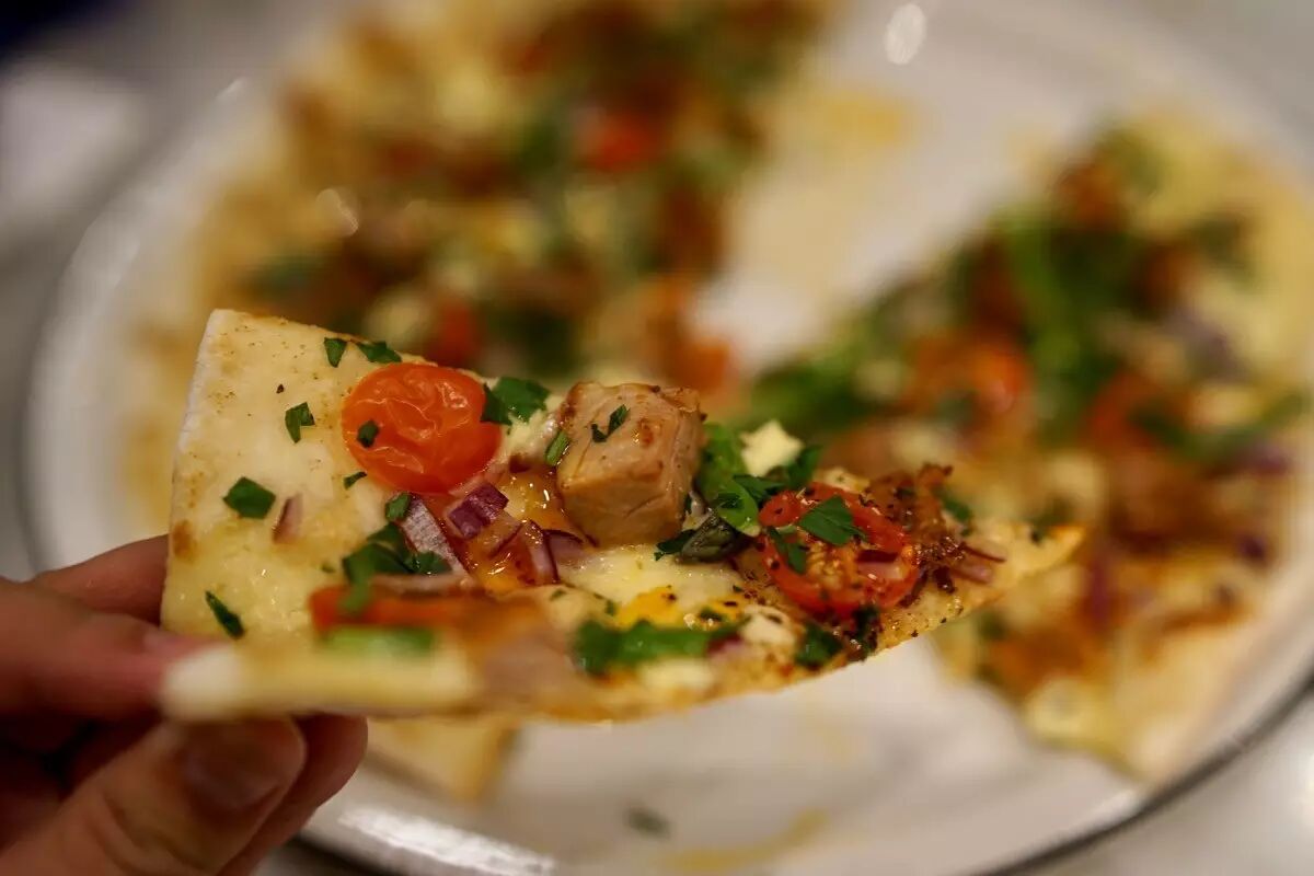 第二道是孜然羊肉味披萨,切块并腌制过的羊肉用低温烹饪两个小时,保证了羊肉鲜嫩的口感,加上孜然等配料一起烤,颇有烤羊肉串的香味。