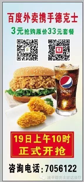 但依然有大多数顾客遗憾错过此次优惠,为了响应广大顾客的强烈要求和回馈全县人民对德克士的喜爱,百度外卖和德克士决定再支出10万预算让利全县人民!只要您是百度外卖新用户就可花3元得到原价33元套餐1份(脆皮腿堡+香辣鸡翅+小杯百事可乐)!