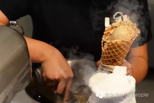 温哥华的第一家液氮冰淇淋LIK N2 Ice Cream,液氮的温度大约是-196℃,制作过程还冒着白雾,制成雪糕口感细腻润滑,还仿佛施了魔法一般,会释放出剧烈的烟,令消费者趋之若鹜。口味包括草莓、香草、越式咖啡等,还可以撒上不同的Topping!