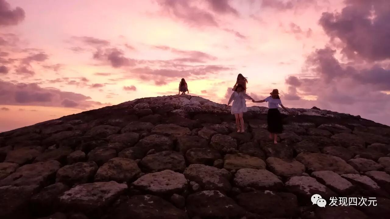 黄昏天很美,四个MM爬到海边堆砌的小山丘上玩耍: