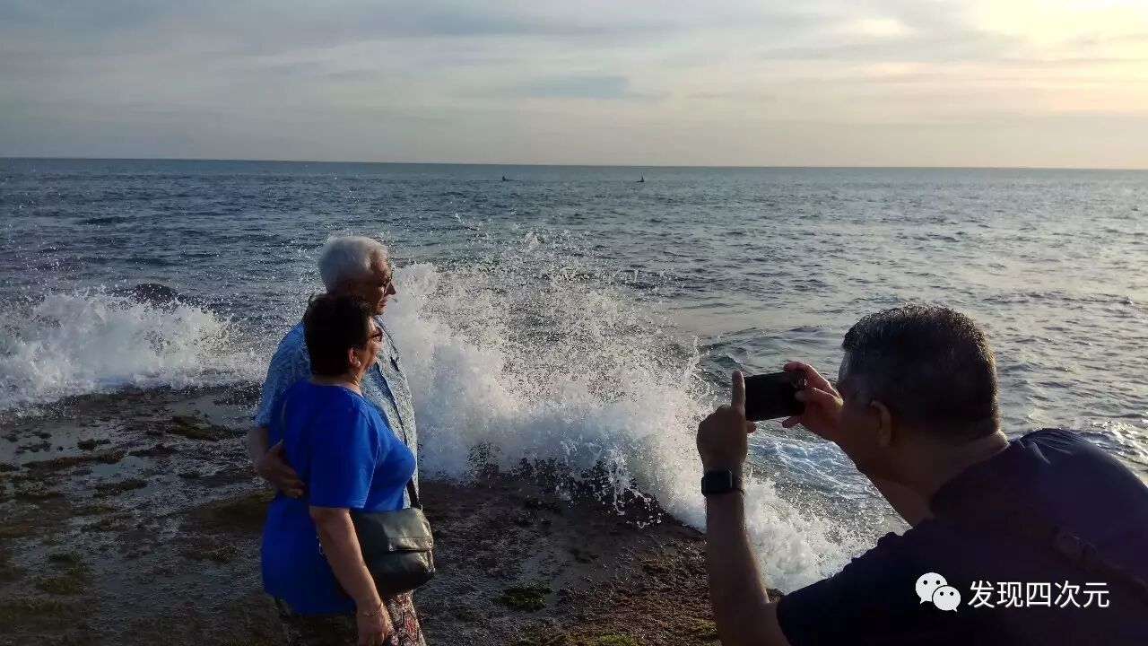 一对中年夫妻,帮一对老年夫妻拍照,他们一直在淡定等浪来的那一刻: