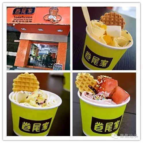 汕头首家泰式炒冰淇淋“卷尾家”类似于炒冰,弄成卷状然后根据不同爱好可加入水果坚果糖果饼干等,既有重口味的榴莲卷卷也有小清新的西瓜卷卷等多种口味~
