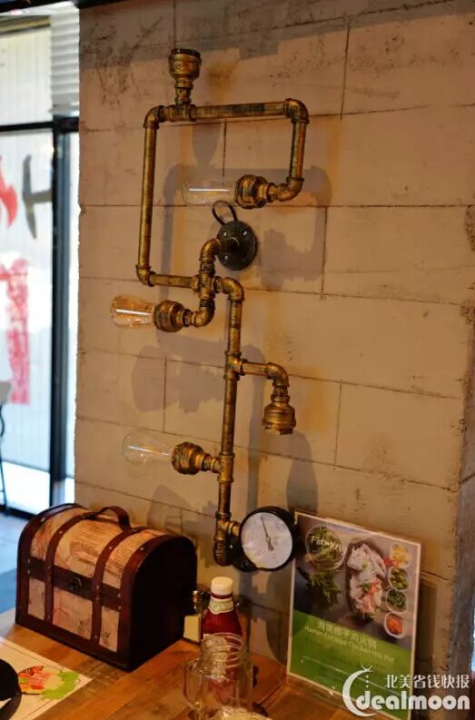 门前的两面大落地窗被挂有店名Flaming House火库的遮阳布覆盖,想要错过都不容易,走进店里,装潢风格独特,让人觉得是误入了某家大型仓库,风格强烈的工业风--做旧砖墙、复古收藏盒、金属管道、压强表、复古车牌等等非常吸睛,开放式的格局让这个餐厅显得穿透明亮。