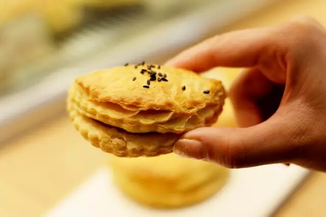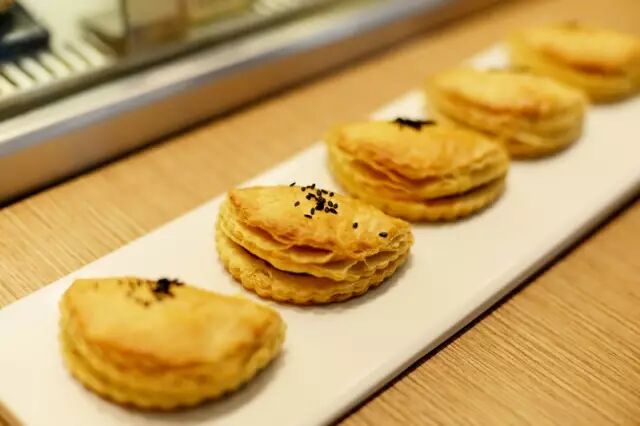 金黄诱人的榴莲酥,以新鲜榴莲果肉配制的软滑馅心,配以层次分明、松化精细的酥皮,让榴莲控们欲罢不能。