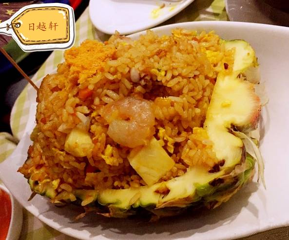 半个菠萝被掏空,炒饭里有鱿鱼粒、虾仁粒、菠萝粒,最上面还有一层肉松,味道咸甜适中。