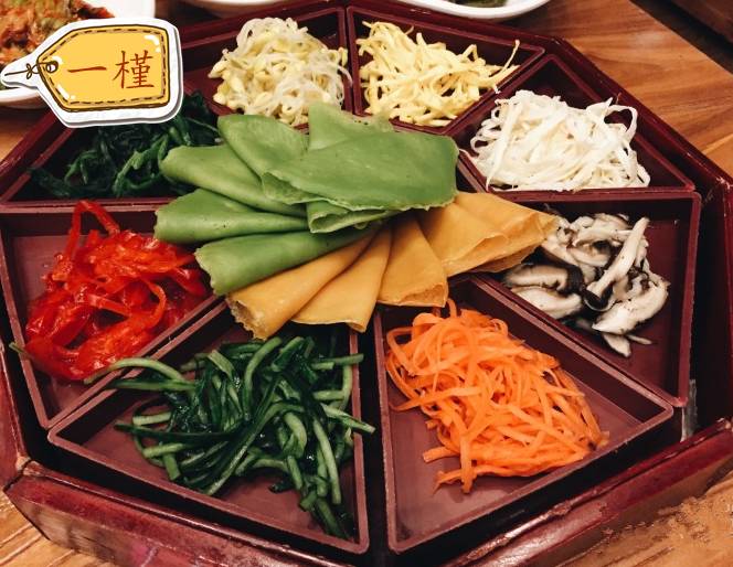 九折板,各种颜色蔬菜切成细丝,用透明的小饼卷好,沾着芥末沙拉酱,搭配烤肉很解腻!