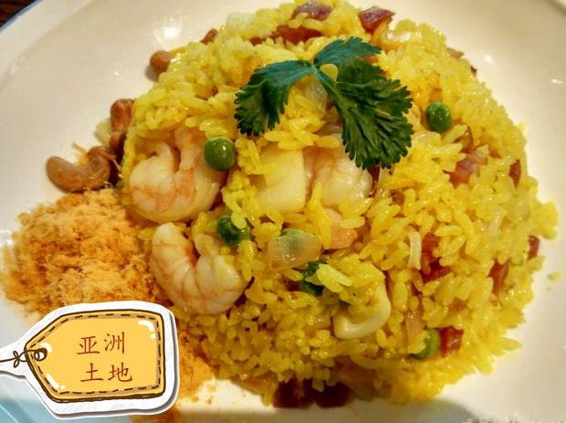 菠萝炒饭里有虾仁、腰果、豌豆、肉丁,还配上了点肉松,吃着很香。可惜没找到菠萝啊~