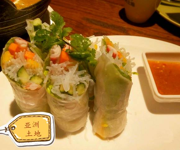越式米纸卷,薄薄的米皮卷着粉丝、黄瓜、胡萝卜、蟹棒和芒果,蘸甜辣酱,吃起来相当清口~