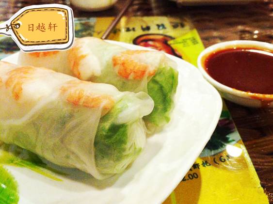 春卷,每只春卷里都有3只虾,由米皮包裹,含有新鲜生菜,蘸酱吃,值得推荐。