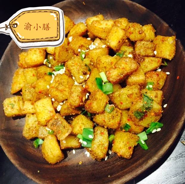 烧烤小土豆,切丁的土豆油炸加了孜然料,土豆丁很入味,自然味道浓郁,盘子很袖珍 。