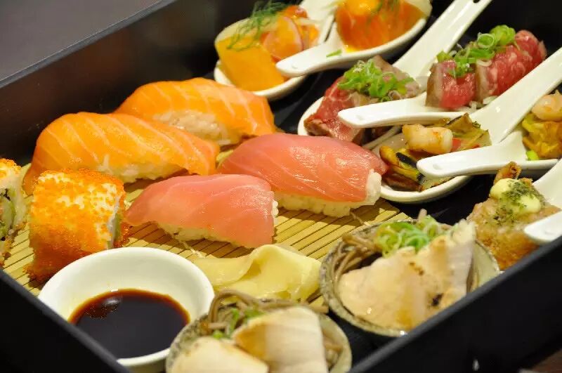 不仅有传统的寿司,生鱼片,天妇罗,照烧三文鱼与鸡肉 还加入了许多受到法国料理影响的创意小吃, 例如经典的牛肉刺身,鹿肉三明治,源于法国的油封三文鱼。光是想下,都让人直流口水呀!