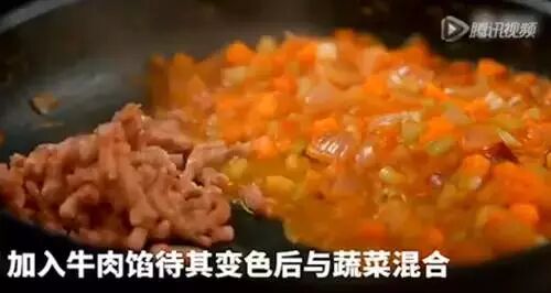 1、馅料的做法:芹菜、胡萝卜、洋葱、西红柿、切成小丁,热锅中放入黄油待其融化,加入洋葱炒至略微透明,放入西红柿炒至熟烂,加盐,倒入胡萝卜和芹菜继续翻炒,加入牛肉馅待其变色后与蔬菜混合