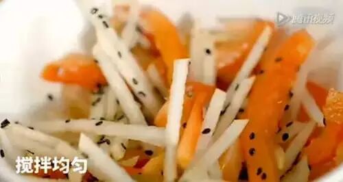 3、甜椒和梨切丝,加入少许黑芝麻,加入适量酱油和醋,搅拌均匀