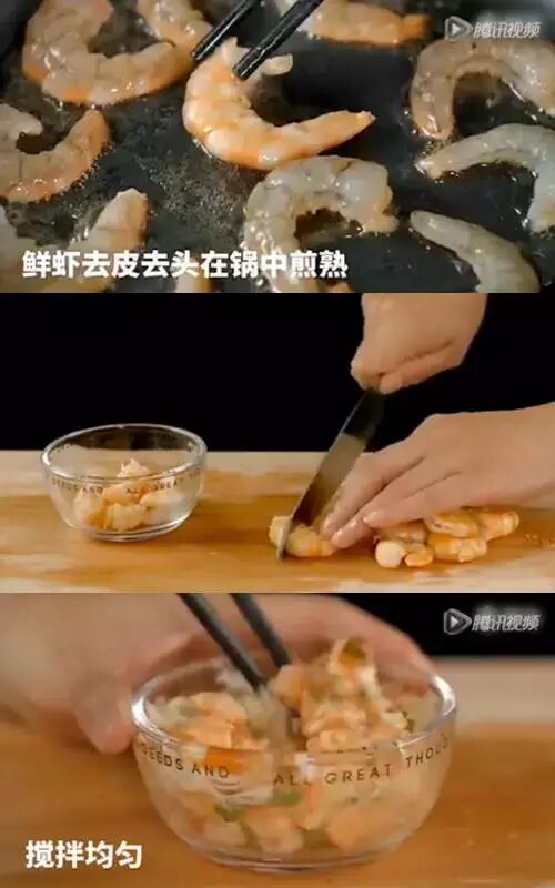2、鲜虾去皮去头在锅中煎熟,虾熟切成小块,加入葱花、蛋黄酱、番茄酱,搅拌均匀