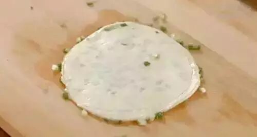 1、面板刷油,放上饺子皮,在饺子皮上刷油,撒上少许葱花、适量的盐