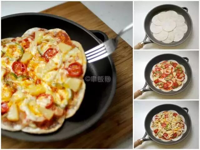 饺子皮叠成花状铺满模具,涂上西红柿酱及各式适合比萨的蔬菜肉类,铺满奶酪,入烤箱,或平底锅,都行。