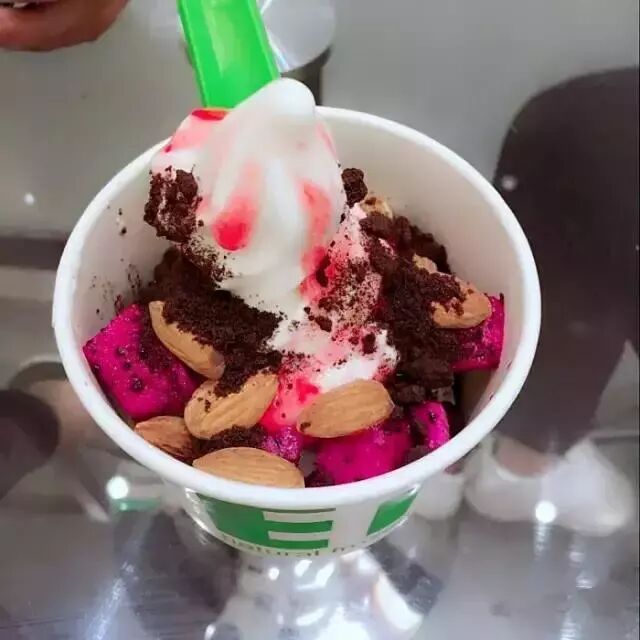 酸奶冰淇淋口感很纯正,水果也非常新鲜。总共有大中小三种尺寸, 然后自己选择要添加的料,料有三种类别:酱汁类、水果类、 坚果类 ,可以自己随意搭配。