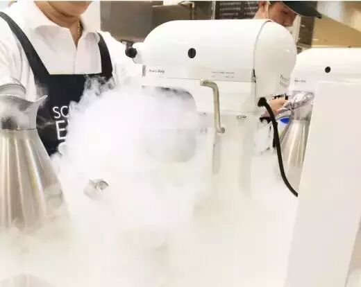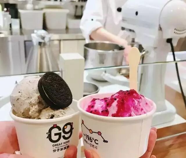 G9分子冰淇淋的原理,就是使用液氮,因为这种气体的沸点极低,-196 可以令冰淇淋急速凝固,除了吃起来更细致以外,还可以减少奶油和牛奶的使用量。更重要的是,利用了分子工艺,所使用的食材,就更可以五花八门,口味繁多。