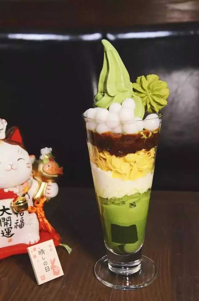 店里主打抹茶系列甜品,無印抹茶至尊冰品类最丰富的,抹茶冻垫底,盖上硬冰激凌球,进口奶油少量,玉米片一层,抹上红豆泥一勺。软冰激凌封顶,加白玉少量,抹茶味曲奇饼干一片。 集结在一个透明的杯子里,层层分明,多重感觉!