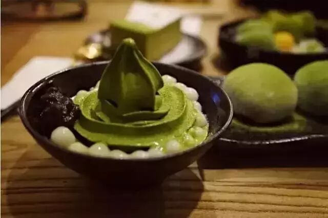 白玉和绿海,这两款是店里颜值最高的甜品。宇治金时绿海是深度抹茶控患者的最爱,也是店里抹茶味最重的甜品,甜度不是很高,里面唯一能制衡抹茶味道的只有绵绵的红豆沙和糖渍栗子了。