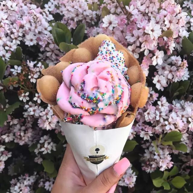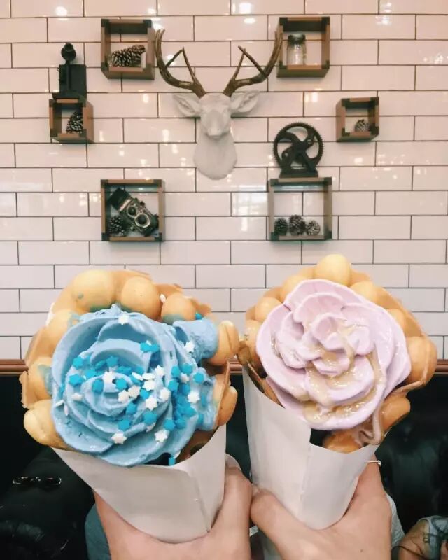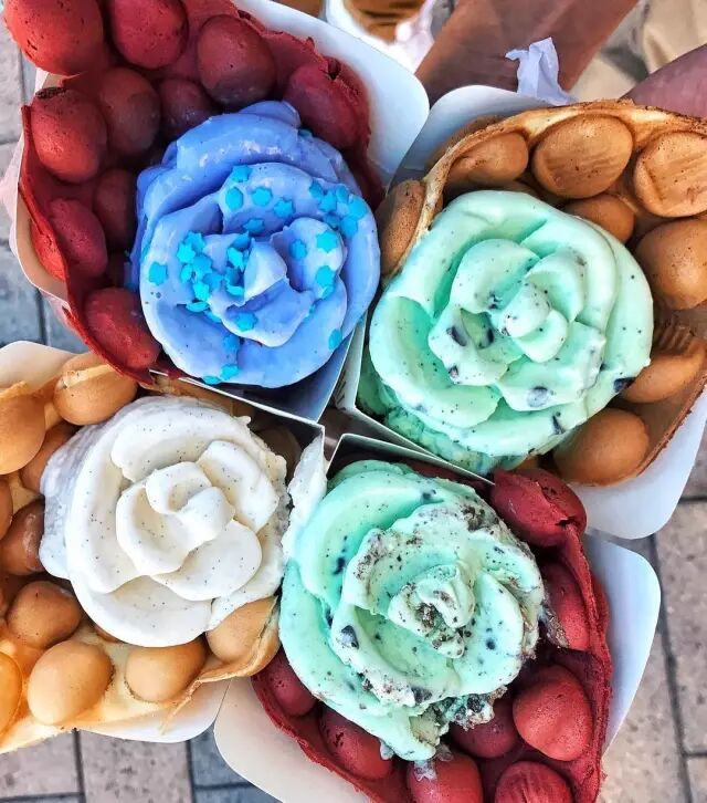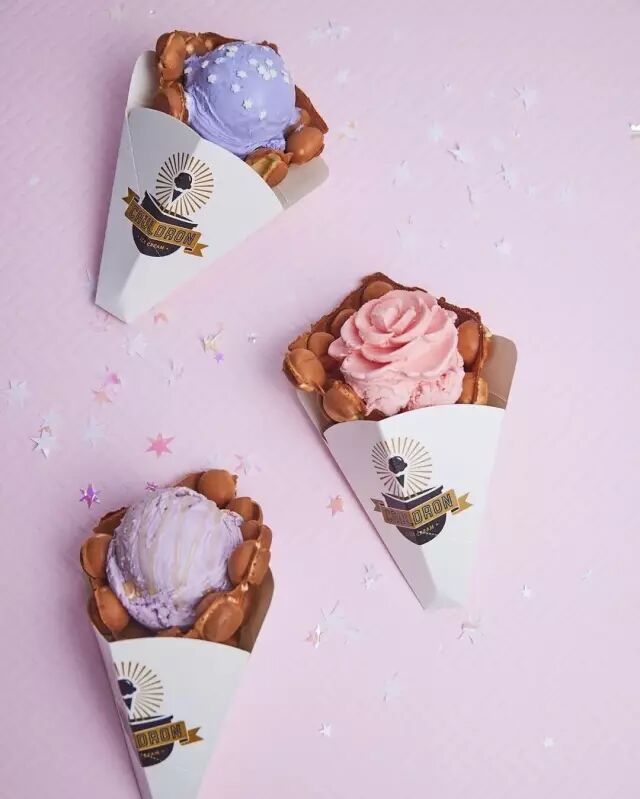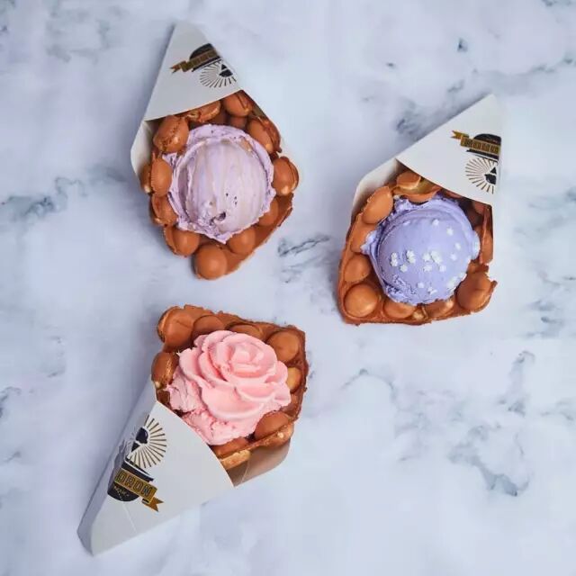 花朵状的冰淇淋球早就见过了,可它家还有个噱头是来自港式的鸡蛋仔配上手工制作的绵密冰淇淋。