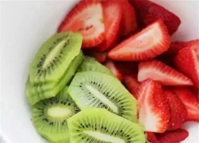 1、猕猴桃去皮,与草莓一起切成约5mm厚的薄片。