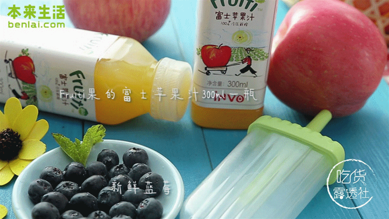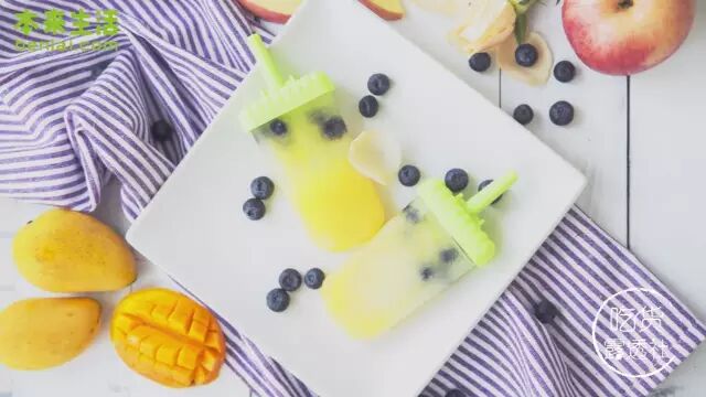 ➤ 制作方法:将蓝莓粒放进模具,倒入富士苹果汁,插入冰棍杆放入冰箱冷冻;