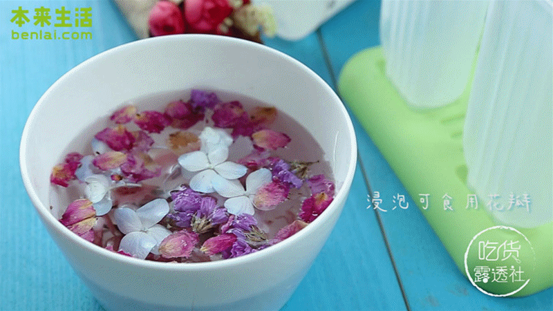 ➤ 制作方法:浸泡可食用花瓣,将花瓣放入模具中,倒入椰子水(注意不要太满),插入冰棍杆放冰箱冷冻;