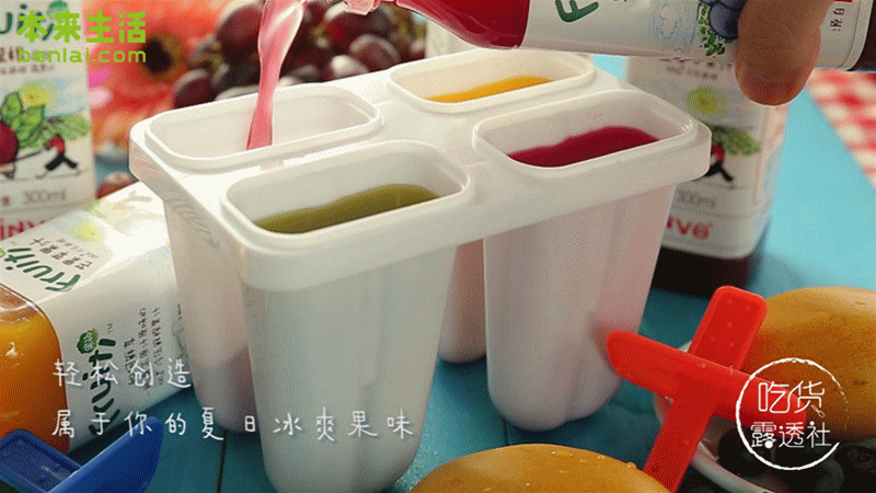 ➤ 制作方法:倒入不同口味的Fruiti果汁,放入冰箱冷冻三小时以上,取出棒冰模具,静待片刻,轻轻取出棒冰~