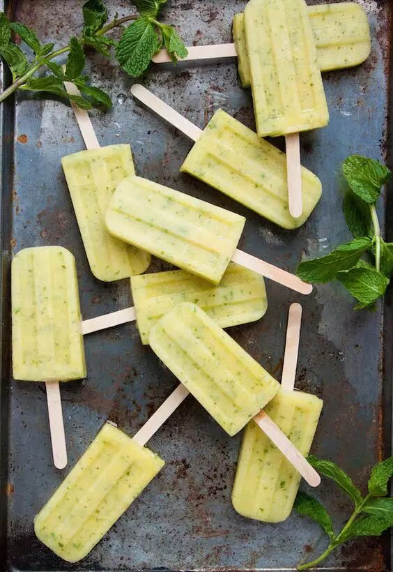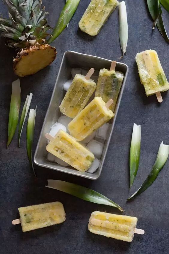 3.把搅碎好的菠萝薄荷叶泥加入到冰棒模具中,放在冰箱里至少4小时,直到冰棒被冻结。
