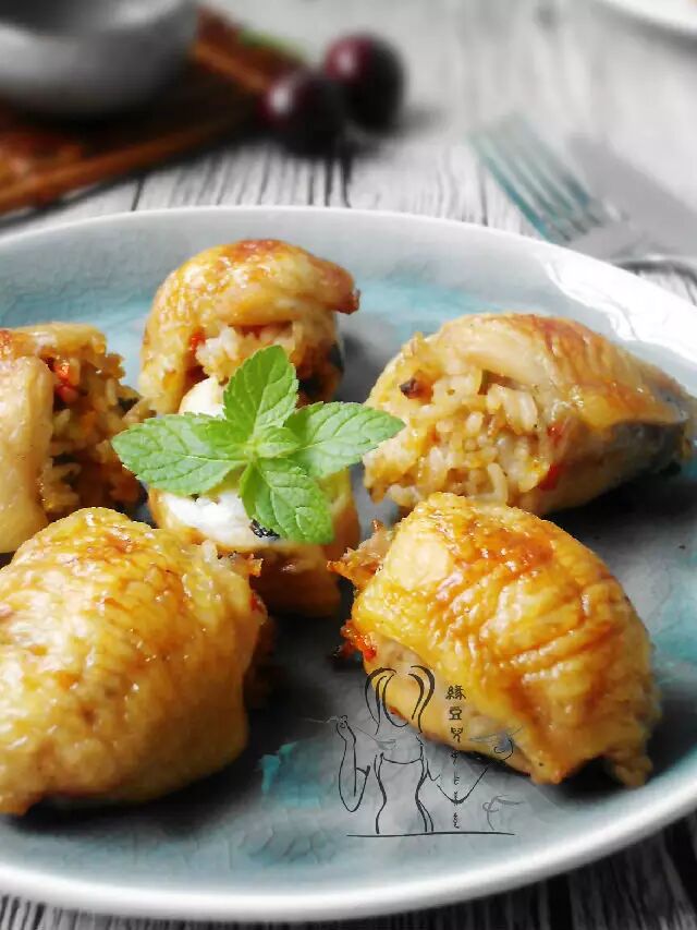 4. 把炒饭用小汤匙塞入鸡翅中,塞实一点;