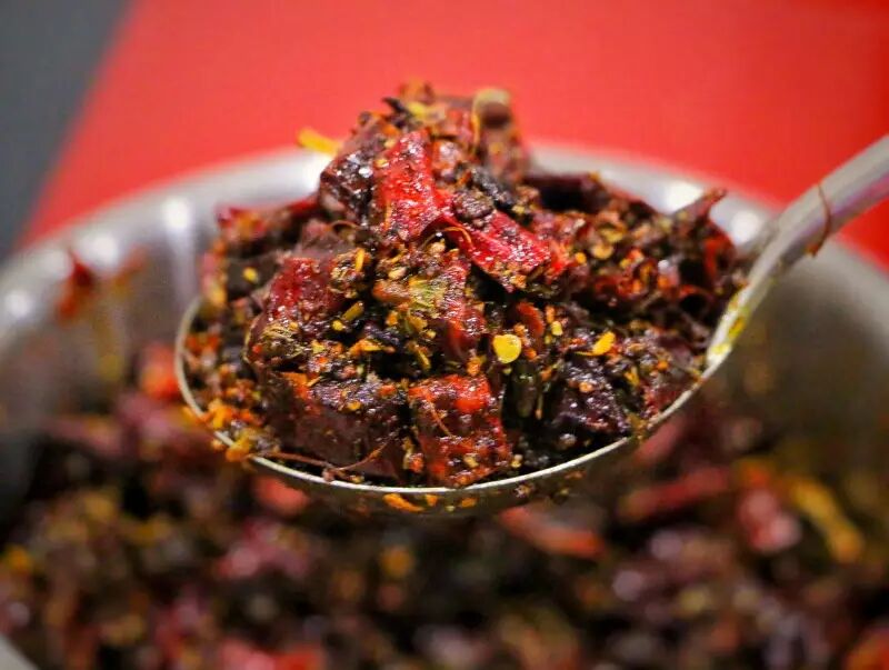 当这些辣椒按照特定的比例调和在一起,就会带来不一样的辣味体验,在炒制过程中,加入八角,茴香,甘草,丁香,藏红花等香料,这些配比的香料不仅可以提香调味,还可以除去辣椒带来的燥热。不怕吃多了上火。