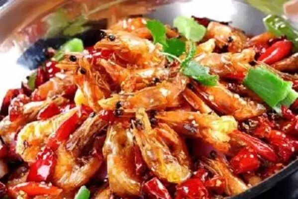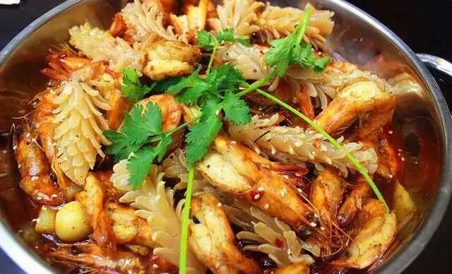 麻、辣、鲜、香的香辣虾选用南美白虾为原料,将北方传统火锅烹制方式与川湘辣味风格完美融合,经过腌、炸、炒、烧、焖等12道工序,加入58种名贵中药材制作而成,其特点是干香脆嫩,辣不灼口,以辣辅鲜,鲜香突出,虾肉细腻滑嫩,汤料爽靓可口,既富含高蛋白高钙质,又大大降低了传统火锅的脂肪含量。