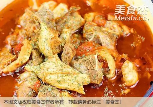 9.然后把炒过的牛肉和板筋放入西红柿的汤头里,盖上锅盖小火炖90分钟即可