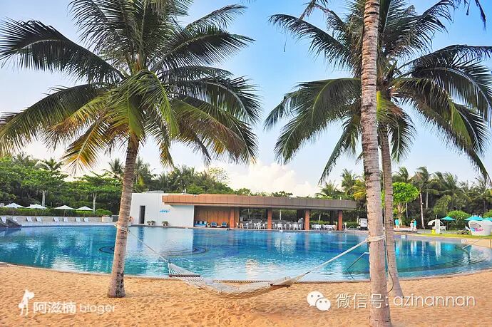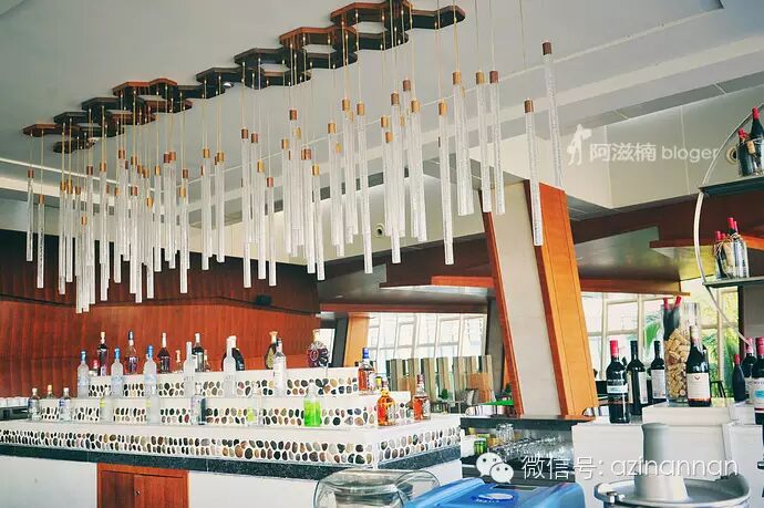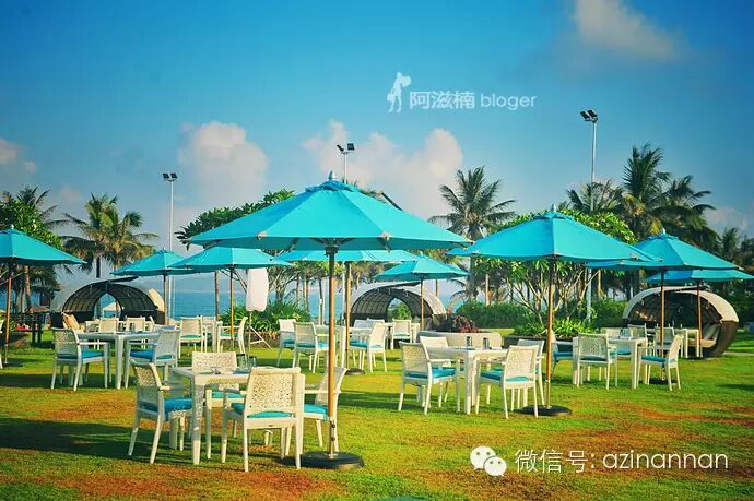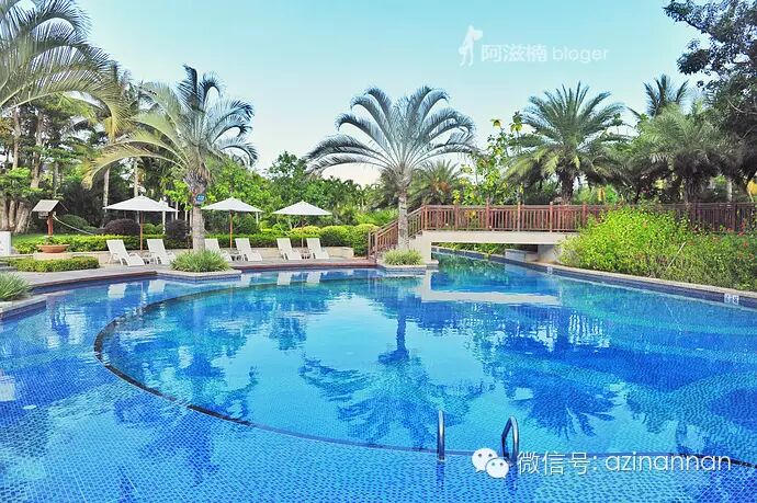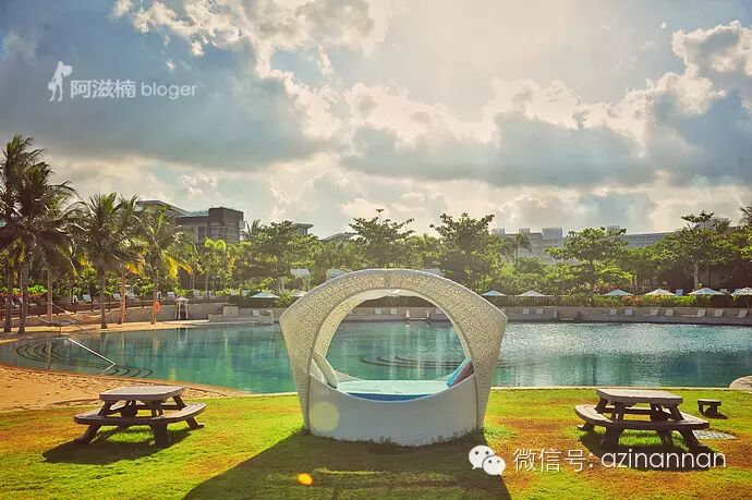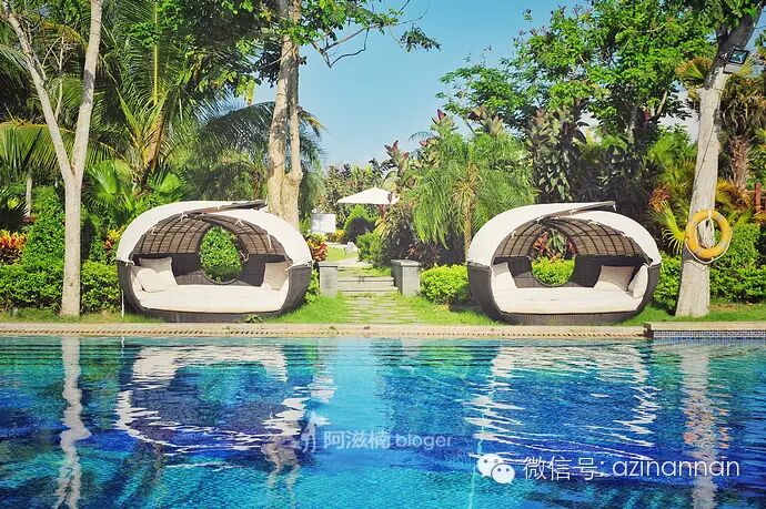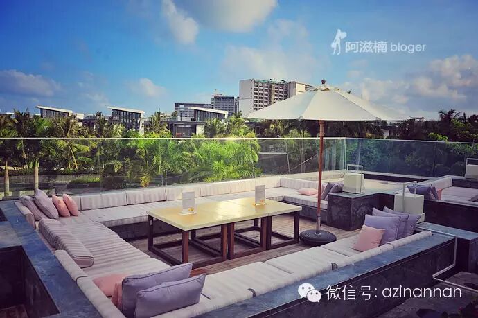 天气炎热的下午我会和小伙伴们坐在二楼的酒水吧聊天~ 远处便是碧海蓝天,身下是绿植成荫的水系泳池~