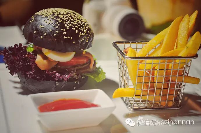 烟熏三文鱼汉堡配菠菜白蘑菇鸡蛋片,竹炭包配菠菜,蘑菇和煮蛋。
